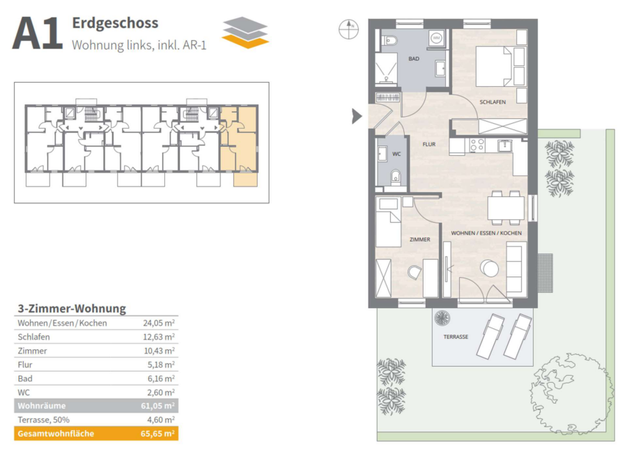 Die Erdgeschosswohnungen überraschen mit sonnigen Privatgärten, die Platz für entspannte Stunden im Freien bieten.