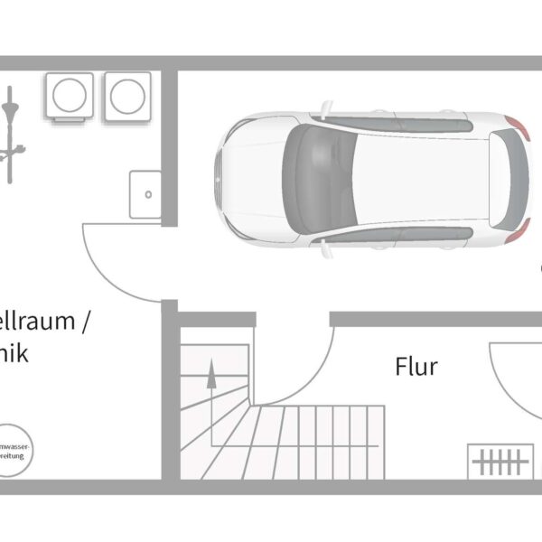 Die Häuser sind auf insgesamt vier Ebenen verteilt. Der Zugang zum Haus erfolgt über die Ebene E1 in der sich die Garage, ein großer Abstell- bzw. Technikraum, mit Platz für die Waschmaschine und den Trockner sowie die Heizung befinden. Die Garage erhält einen direkten Zugang zum Haus, sodass man trockenen Fußes zum Auto gelangt.