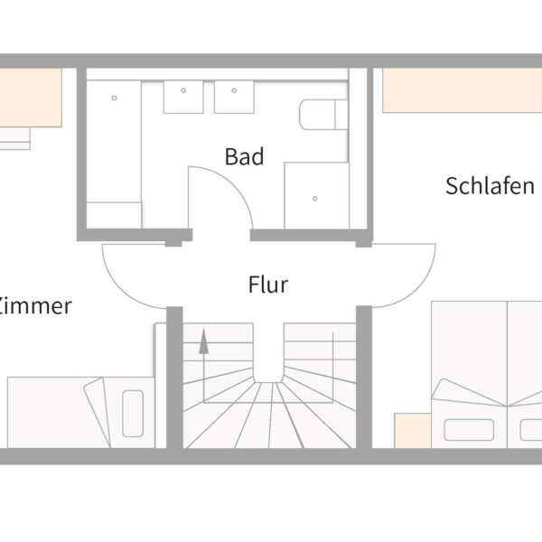 Im Obergeschoss befinden sich zwei Schlafräume sowie das Masterbad, welches mit einer Badewanne, einer Dusche, einem WC und zwei Waschbecken ausgestattet ist.
