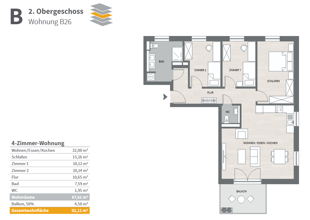 Der offene Wohn-/Ess- und Kochbereich schafft eine einladende Wohnatmosphäre und bildet das Herzstück der Wohnung. Von hier aus gelangen Sie auf den Balkon, der zusätzlichen Raum zum entspannen im Freien bietet.