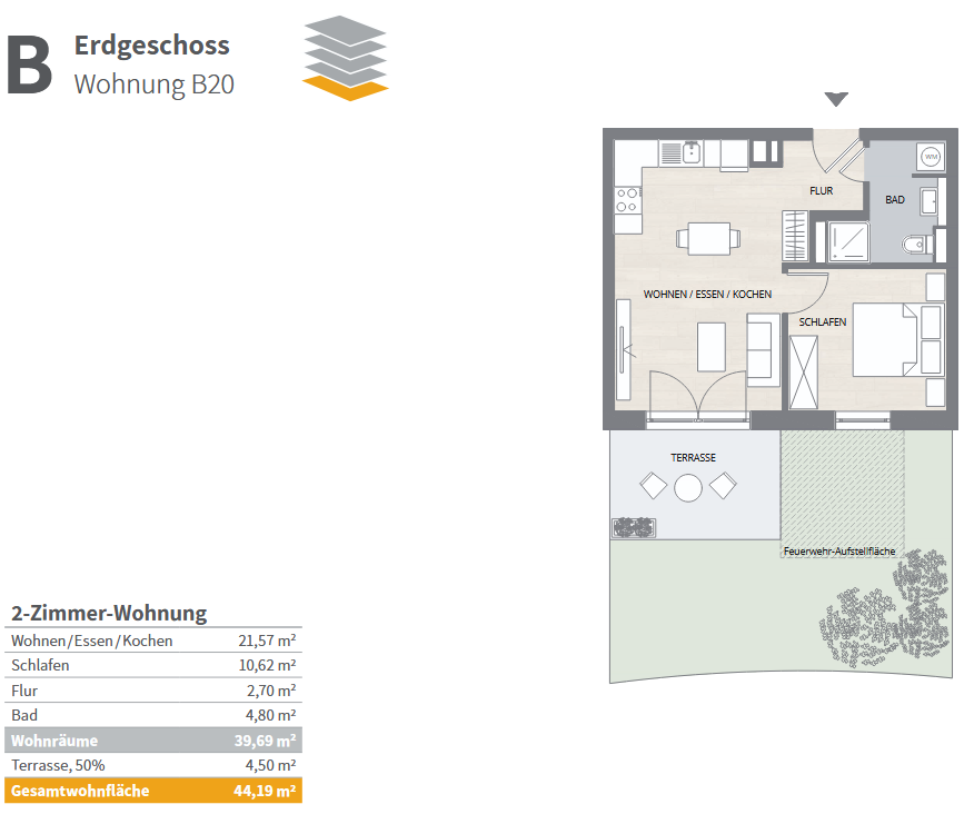 Diese gut geschnittene 2-Zimmer-Wohnung überzeugt mit einer kompakten und funktionalen Aufteilung auf ca. 44 m². Der Wohnbereich bietet Zugang zu einem kleinen Gartenanteil, der zusätzlichen Freiraum im Grünen schafft und das Wohnen besonders angenehm macht.