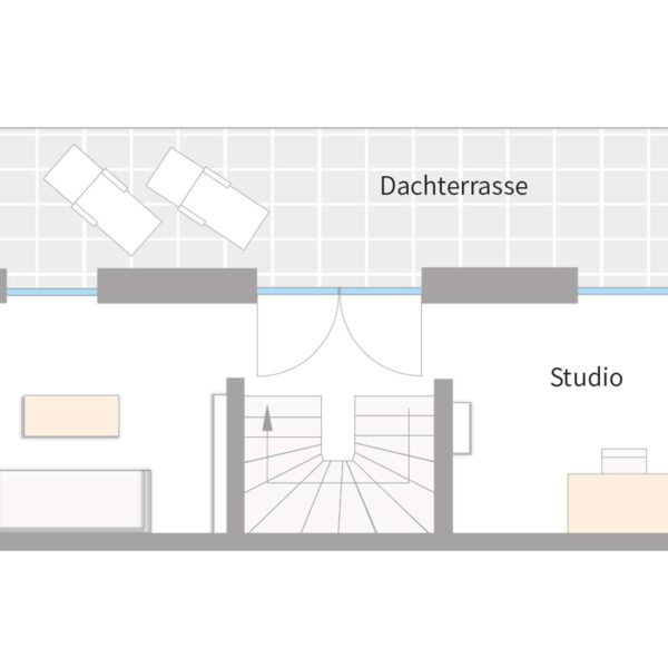 Die Häuser sind auf vier Ebenen verteilt. Im Untergeschoss betritt man durch den Hauseingang direkt den Flur, von dem aus eine Treppe in die Ebene E1 führt. Die Ebene E0 umfasst zusätzlich eine Garage sowie einen Abstellraum, in dem die Heizung und die Anschlüsse für Waschmaschine und Trockner untergebracht sind. In der Ebene E1 eröffnet sich ein großzügiger und offener Wohn-, Ess- und Küchenbereich, der direkten Zugang zur Terrasse und zum Gartenanteil nach Südwesten bietet. Auf dieser Ebene ist zusätzlich ein separates WC geplant. Über den Treppenaufgang gelangt man in die Ebene E2. In dieser Etage befinden sich zwei Schlafräume, welche durch das in der Mitte liegende Badezimmer getrennt werden. Das Badezimmer wird mit einer Badewanne und einer Dusche sowie einem WC und zwei Waschbecken ausgestattet. Das großzügige Studio mit Zugang zur Dachterrasse liegt im Dachgeschoss in der Ebene E3. Durch das Flachdach kann der Raum als vollwertiger Raum genutzt werden. Wer aus diesem großen Studio weitere Räumlichkeiten und ein zusätzliches Dusch/WC schöpfen möchte, kann den Ausbau als Sonderwunsch in Auftrag geben. Zusätzlich verfügen die Häuser über einen Außenstellplatz.