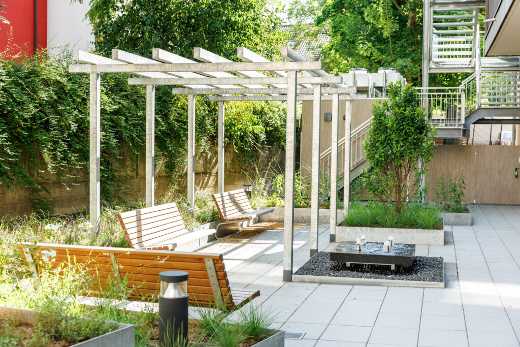 Das Hospiz hat insgesamt acht Gästezimmer. Ein begrüntes Fassadenelement dient auch als Lärmschutz. Bei der Planung wurde darauf geachtet, dass die notwendige Privatheit und Rückzugsmöglichkeit für die Hospizgäste gewährleistet sind.